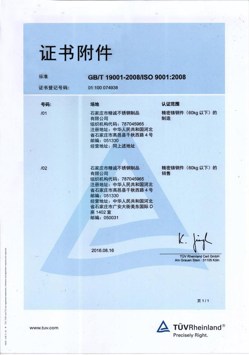 石家莊市精誠(chéng)不銹鋼制品有限公司,是一家從事專業(yè)精密鑄造的企業(yè)。主要生產(chǎn)不銹鋼、合金鋼、低碳鋼及各種特種合金材質(zhì)的精密鑄件及加工產(chǎn)品。